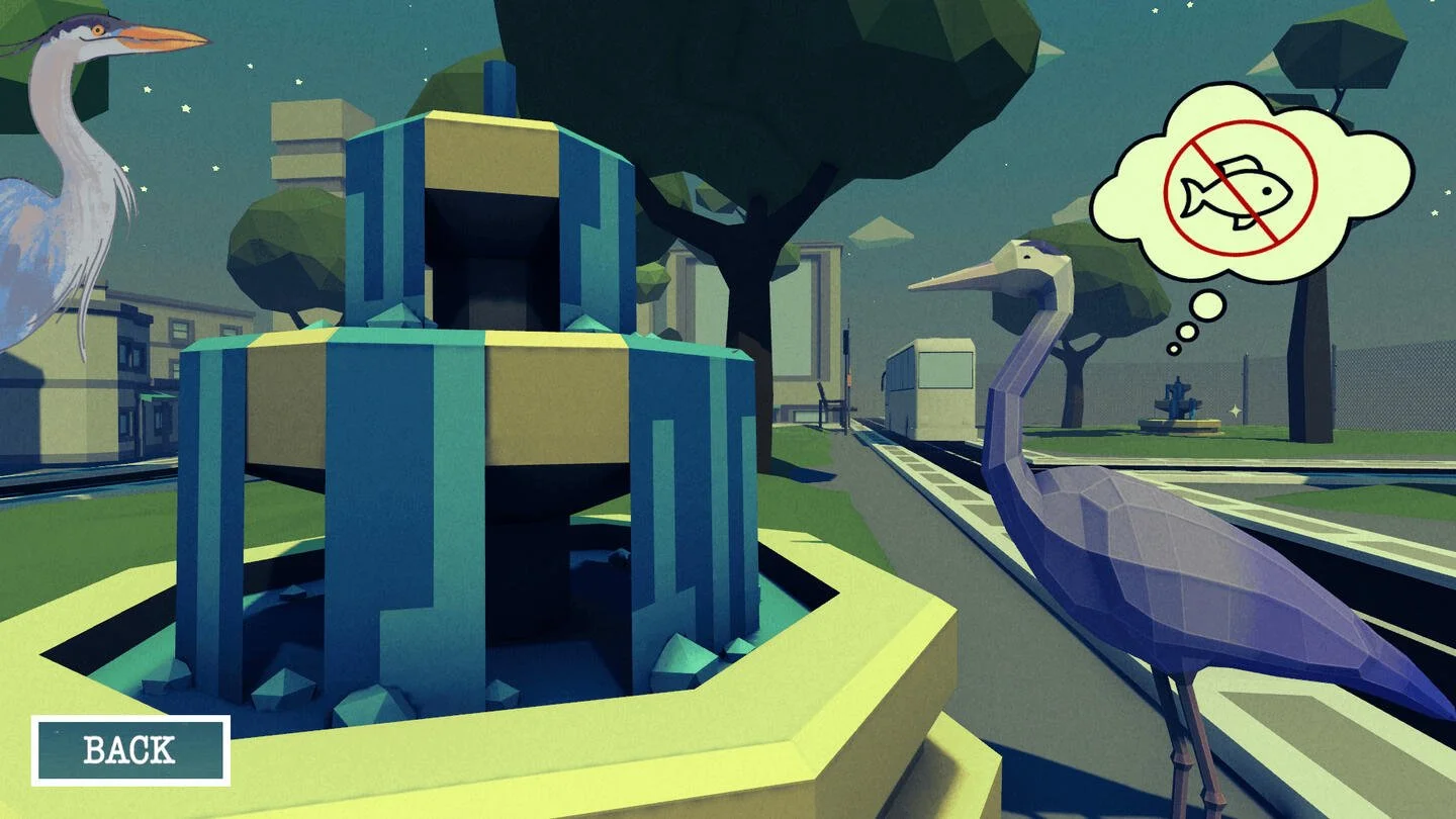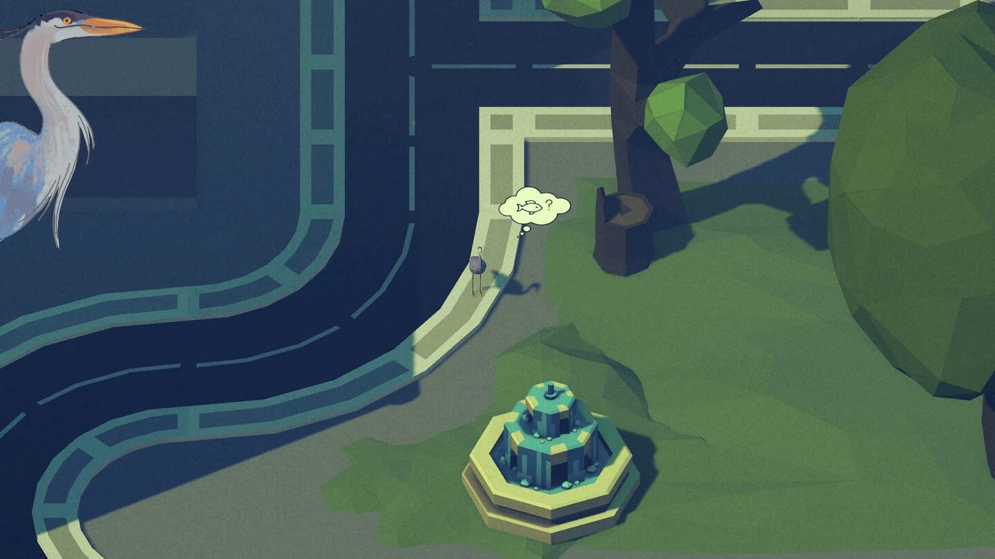 Plenty of Fish in the City is a 3D isometric adventure game where a lost heron searches for fish in city fountains. The game was built in response to a prompt to evoke a specific emotion in the player. We chose longing.